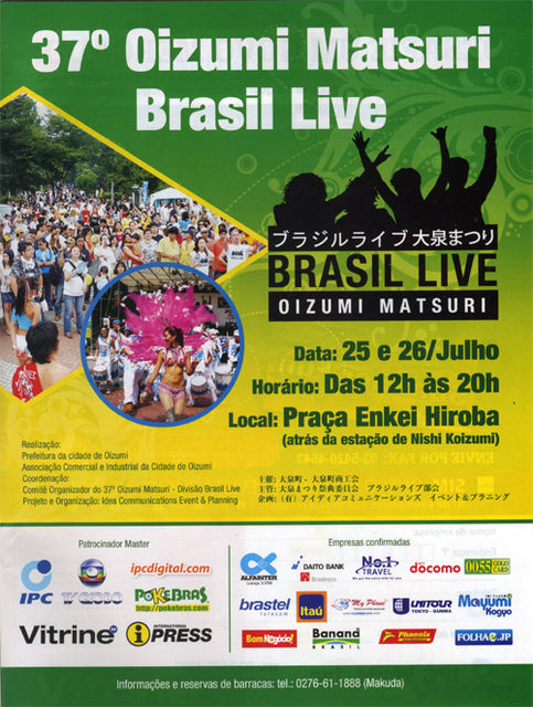 第37大泉祭り ブラジルライブ大泉祭り2009 場所:邑楽郡大泉町西小泉西小泉駅前・国道354号周辺 期日:2009年7月25日〜2009年7月26日 時間:12:00〜20:00 交通:東武小泉線西小泉駅からすぐ(西小泉駅前) 東北自動車道館林ICから国道354号を大泉方面へ車で15km(西小泉駅前) 駐車場:あり(1000台 無料 町内各所の臨時駐車場利用) お問い合せ:0276-63-3111 大泉町経済課商工振興グループ 群馬県の南東に位置し、日系ブラジル人をはじめとする外国人が大勢住む大泉町。毎年、町の人口を上回る20万人以上が訪れる夏の風物詩「大泉祭り
