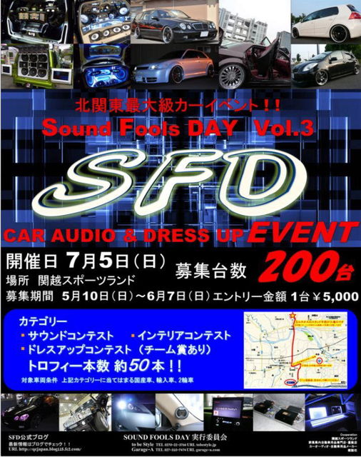 来たる7月5日に吉井町の関越スポーツランドで群馬のカーオーディオイベント、 Sound Fools DAY Vol.3が開催される事となりました 今回のイベントはこのコミュからも何人もエントリーされる事と思いますが、 より多くの方にイベントを知っていただきたくて告知させて頂きます 当日は自分もエントリーしますので、良かったら皆さん遊びに来て下さいね 一般来場の方はもちろん無料です またエントリーがまだの方もエントリー受付は6月7日までなので、 遅れない様にして下さいね イベントの概要はこ