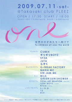 告知失礼致します! お世話になります! いよいよ 残す所10日を切りました 追加事項があります 宜しく御願い致します!! 2009.07.11(土) 高崎club FLEEZ OPEN/17:30 START/18:00 ticket 前売/\2,500+D 当日/\3,000+D 「ONE」 【GUEST】 ■らぞく ■CUBEX ■ギリギリBOYZ ■SYZA ■JUTA 【ACT】 ■G-FREAK FACTORY ■NAIKA MC ■STR JAM-ME 【DJ】 ■MijA ■GREEN SUN SHOWER 【ART】 TOTAL ART RELATION 【LASER】 ■ILDA BOYZ 【LIVEpaint】 ■S.I.D.G ■12【NEW】 ■EIJI【NEW】 【yoga】 ■Erica 【
