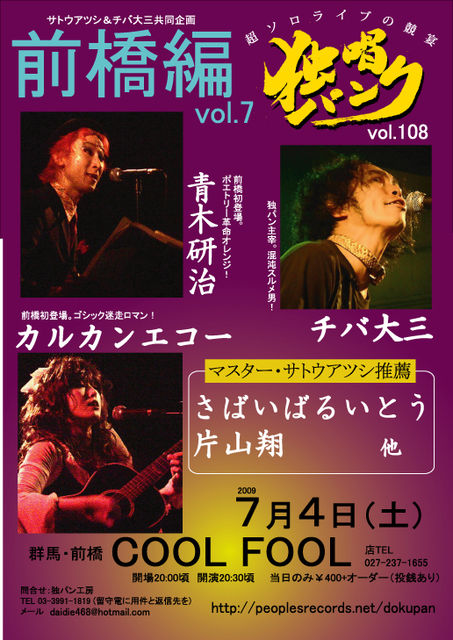 7月4日(土) 『前橋編vol.7』 (独パンvol.108) 群馬・前橋COOL FOOL http://mixi.jp/view_community.pl?id=766040 (? 027-237-1655) 開場20:00頃 開演20:30頃 当日のみ\400(オーダー別) 【出演】 ★青木研治(from東京) ★さばいばるいとう ★カルカンエコー(from東京) ★片山翔 ★チバ大三(from東京) 他 東京から青木研治とカルカンエコーが、COOL FOOL初登場です。 前橋近郊の皆様お見逃しなく! 独唱パンク・コミュ http://mixi.jp/view_community.pl?id=2668602