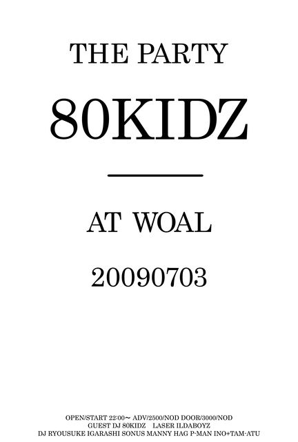 告知失礼いたします! 今回は先日待望のファースト・フル・アルバム『This is my Shit』をリリースし、7月にはフジロック09にも出演する「80kidz」をゲストに迎えます。 -SUPLAY- presents,,, 〜THE PARTY〜 80kidz「THIS IS MY SHIT 」Release tour 2009/07/03(fri) @WOAL OPEN/START 22:00〜 ADV:\2500/NOD DOOR:\3000/NOD 【GUEST DJ】 80kidz http://www.myspace.com/80kidz http://mixi.jp/view_community.pl?id=1993634 【DJ,s】 RYOSUKE IGARASHI SONUS P-MAN MANNY H