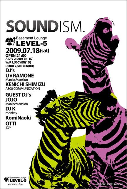 U★RAMONE(ManiacMansion)、清水健一(A300 Communication)オーガナイズによるニュー・イベントがスタート! ManiacMansionからDJ JOJOもゲスト出演します。 『SOUNDISM.』 2009.07.18(sat) @Basement Lounge LEVEL-5 OPEN 9:00PM. DJ's: U★RAMONE(ManiacMansion) 清水健一(A300 Communicaton) GUEST DJ's: JOJO(ManiacMansion) K(monkey.) KomiNaoki OTTI(JOY) ■ADMISSION A.D.V 2,000YEN(1D) With Flyer 2,500YEN(1D) DOOR 2,500YEN(0D) ■TICKET INFOMATION: ・Basement Lounge LEVEL-5 0277-46-71