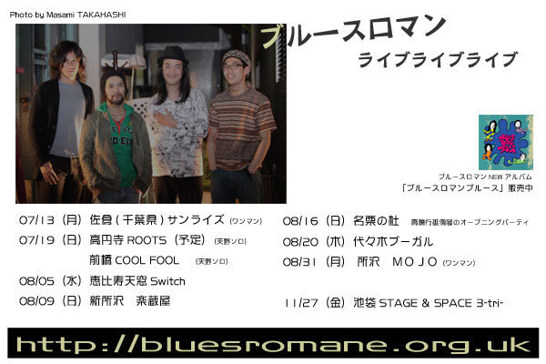 ****************************************** ブルースロマン☆次回のライブのお知らせ♪ ****************************************** ◆07/19(日)高円寺ROOTS (天野・鎌田・渡辺でいきます!) (http://www.muribushi.jp/information.html) ---------------------------------------- ◆前橋COOL FOOL (天野・鎌田・渡辺でいきます!) (http://sound.jp/coolfool/pc/index.html) pm8:00〜 ¥400/Drink別 ◎所在地◎ 前橋市千代田町5−2−10 SATOビル2F TEL:0