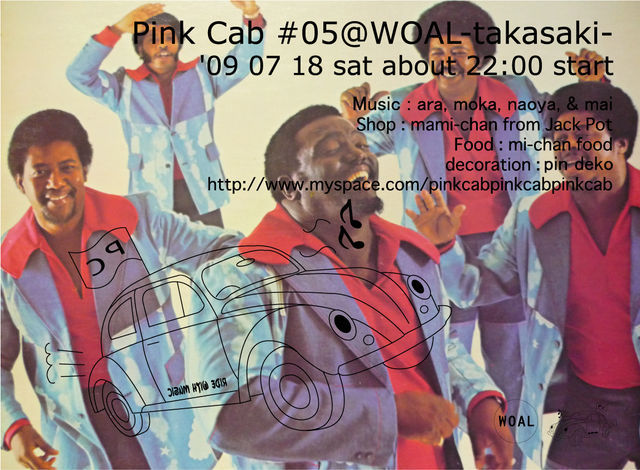 深夜 Music Taxi ”Pink Cab” <<about Pink Cab>> 2009年3月に生まれたMusic Taxi・Pink Cabです!いい音楽を聴きながら、踊って、お酒とか飲んで楽しくドライブ中。 Body Music〜Head Musicまで刺激的な音楽で、光の届かない深海から何万光年も離れた宇宙の果て、0から100までどこでもお連れしましょう。 Pink Cab号はみなさんのグッドバイブレーションで走ります!運行は月に一度、第3土曜日深夜にのみ。ご乗車お待ちしております。 Ride With Music! 2009 07 18 (Sat) Pink