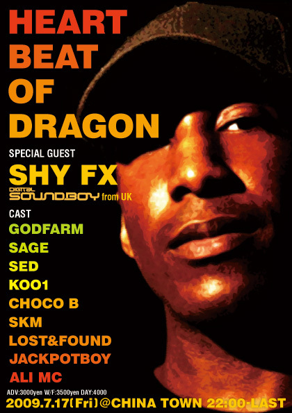 2009年5月で6周年を迎えた"HEARTBEATOFDRAGON"はDRUM&BASSを中心にクラブミュージックシーンの最前線で活躍しているアーティスト集団。現在までに国内外の様々なアーティストを広島に招聘、日本のクラブミュージックシーン発展に大きく貢献してきた。現在、レーベル立ち上げに向けて個々の楽曲制作や、DJの活動範囲を広島や東京を中心に全国へと進出するなど、凄まじい勢いで進化を遂げ続けている。そして、2009年初となるDRUM&BASSスペシャルゲストは、待望の初来広となる"SHY FX"!!