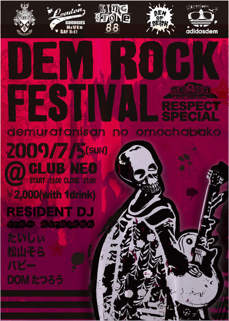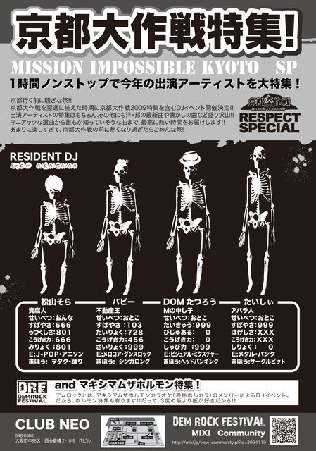 2009年3月に開催し、好評を頂いたDJイベント。 デムロックの第2回開催が決定しました!! 第1回よりも会場規模を大幅に拡大しての開催です。 さらに今回は、"京都大作戦"と"マキシマムザホルモン"を大特集!! 京都行く前に騒ぎな祭!! 京都大作戦を翌週に控えた時期に京都大作戦2009特集を含むDJイベント開催決定!! 出演アーティストの特集以外にも洋・邦の最新曲や懐かしの曲など盛り沢山!! マニアックな選曲から誰もが知っていそうな曲まで、最高に熱い時間をお届けします!! そして、デムロックとは、マキシマムザホルモンカラオケ(