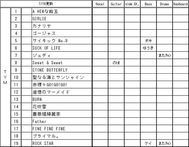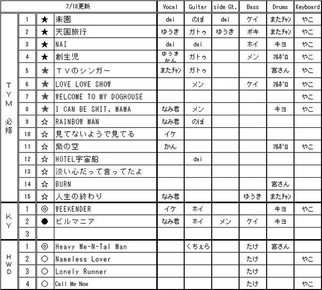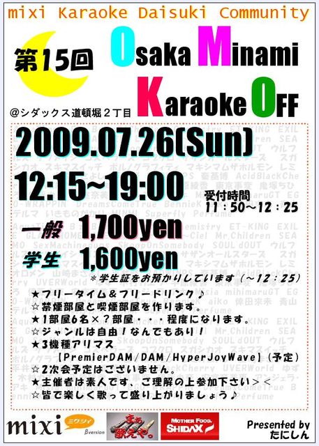【更新】 06/20 声だし・ファイナルリクエスト開始 持ち物追加 07/02 2次会決定・参加募集開始 07/20 スケジュール一部変更、追記 07/21 声だし・ファイナル募集開始 募集期限変更22日→23日 07/22 声だし・ファイナル・縛りセトリ完成 一部立候補更新 2次会会場名修正(※店の名前が変更になっただけで場所は同じです) 07/23 部屋割り決定 今回は私めが立てさせていただきます。 世間では豚インフルが流行ってるようですが そんなものには負けないんだぜ! って勢いで、歌いまくってやり