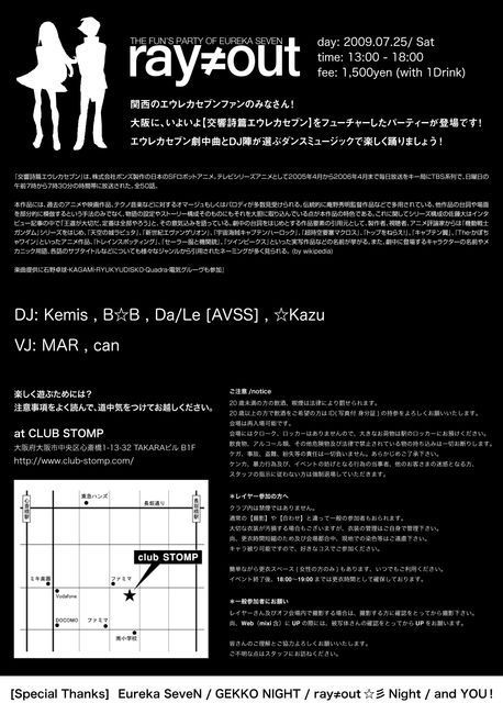 【2009年7月22日AM9:10更新】 集合時間の再度告知!コス参加者は18:15、一般参加者は18:45に集合場所へ! 【2009年5月30日PM2:00更新】 *ray=out☆彡Nightは、クラブイベントではなく、ファンによるmixiオフイベントです。 クラブイベントは0次会にて行います。0次会会場までは歩いて45秒!! ------------------------------------------- 「ray=out☆彡Night(レイアウトシューテングスターナイト)」が決定!!! ------------------------------------------- 劇場版も公開されて皆さん「モキュ」っとされましたか?! BD/DVDも発売も決定