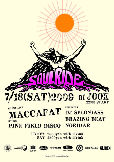 PDS presents ■SOULRIDE2009■ 7月18日(土曜日)場所:JOOK 21時開場予定 -LIVE- MACCAFAT(マカファット) -SOUND- PINE FIELD DISCO -SELLECTOR- DJ SELONIASS BRAZING BEAT NORIDAR チケット\2,000-1DRINK付 当日 \2,500-1DRINK付 チケット取扱店 FILE 唐津市紺屋町1668-1 0955-72-7277 YIN&YANG 唐津市千代田町2109-12 0955-72-4853 BUNGA 唐津市平野町1616 0955-75-3255 TRUTH 唐津市西浜町1-62-101 0955-75-0148 GIJIREN 唐津市熊ノ原3140 090-71583189 JOOK 唐津市
