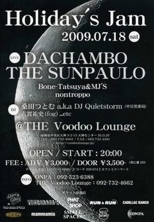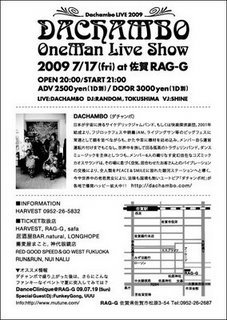 佐賀、福岡 チケット当店で発売中 ■7/17 (金) 「Dachambo LIVE2009」@RAG-G (SAGA) 九州【佐賀 RAG-G(SAGA)】 open 20:00 / start 21:00 ■ADV :2,500yen (1D別) / DOOR 3,000yen (1D別) ■LIVE : Dachambo ■DJ ; RANDOM / TOKUSHIMA 7/18 (土) Holiday's Jam @THE Voodoo Lounge (FUKUOKA) 九州【福岡 THE Voodoo Lounge(FUKUOKA)】 open 20:00 / start 20:00 ■ADV : 3,000yen (1D別) / 3,500yen (1D別) ■LIVE : Dachambo / THE SUNPAULO / nontroppo Bone-Tatsuya & MJ’S ■