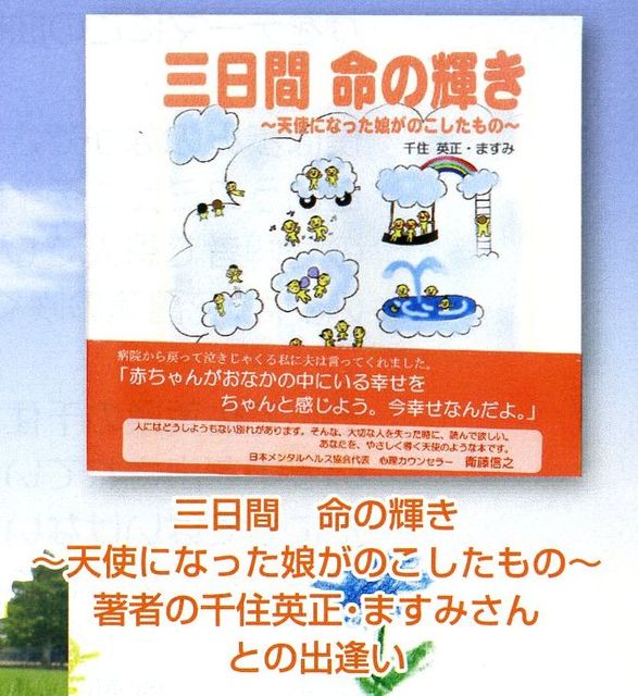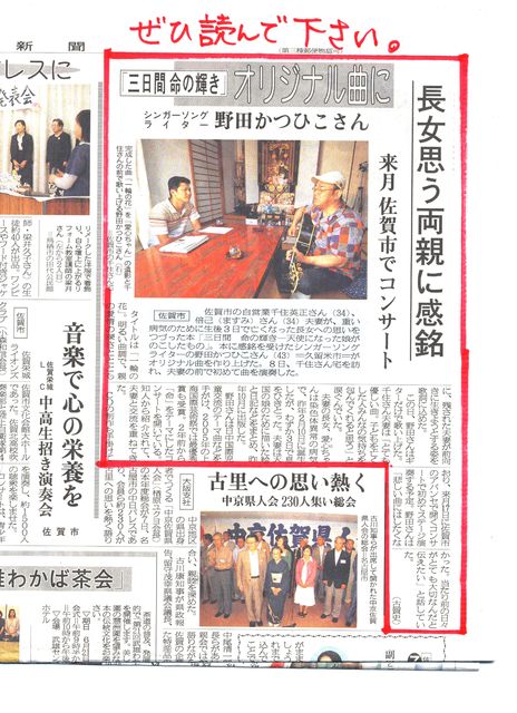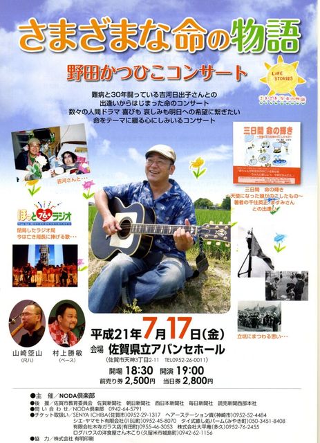 みなさま、昨年ですが佐賀で一冊の本になった「三日間命の輝き」という本を知っていらっしゃいますか。 生後3日間で天使になっていった愛心(まな)ちゃんの本です。 そして、その愛心(まな)ちゃんのために作られた歌「一輪の花」があるのです。 いま、わたくし達、命のコンサート実行委員会によってその歌を是非、佐賀アバンセホールにて皆様へ伝えようと活動をしております。 久留米出身のシンガーソングライター野田かつひこ氏が、重症筋無力症という難病と闘っている患者様との出会いからはじめられた「さまざまな命の物語コンサート」