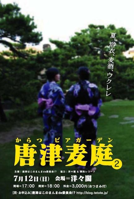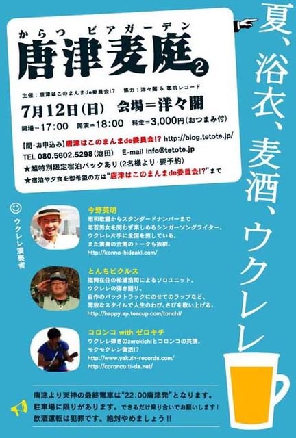 昨年の浴衣姿が今にも目に浮かぶ、会場は唐津が世界に誇る洋々閣。 出演は、変わらずウクレレ片手に全国を旅している今野英明さん。抜群のトークと、昭和歌謡からスタンダードナンバーまで老若男女楽しめるシンガーソングライターが贈る、梅雨明け最初の夕涼み。今年は新たに、その特異すぎるスタイルでウクレレを操る博多が生んだスパースター「とんちピクルス」、澄み渡る声で世の男性陣を魅了するコロンコと引き語るウクレレにうっとりのzerokichiさんが共演。 と豪華な顔ぶれ。 ビール片手にウクレレの音色に耳を澄ます、そんな素敵な