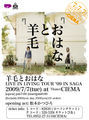 七夕の夜に佐賀は「CIEMA」にて素晴らしいLIVEを開催。 2009.07.07(TUE) 羊毛とおはな「Live in Living '09」九州ツアー in'佐賀 七夕SPECIAL!! @CIEMA 佐賀市松原2−14−16セントラルプラザ3F http://ciema.info/ 19:00〜 会場 20:00〜 開演 GUEST LIVE: 羊毛とおはな http://www.youmoutoohana.com/top.html 松本かつひろ(SO.) http://www.katsu-hiro.com/katsu-hiro_top.html ローソンチケット[0570-084-008 / L コード : 82830] チケットぴあ [0570-02-9999 / P コード : 326-520]
