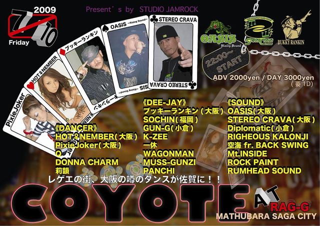 レゲエの街 大阪でウワサのDANCE!! "コヨーテ"が遂に佐賀上陸!!! 〜COYOTE 九州ツアー in 佐賀〜 2009/7.10(fri) @RAG-G (佐賀市松原3-54 TEL:0952-26-2687) 前売 \2000 (要1D) 当日 \3000 (要1D) 22:00〜START! ★★Special Guest SOUND★★ OASIS RISING SOUND(fr.大阪) STEREO CRAVA(fr.大阪) ★★Special Guest DEE-JAY★★ BUKKY RANKIN(fr.大阪) ★★Special Guest DANCER★★ HOT♀NEMBER(fr.大阪) PixieJoker(fr.大阪) ★SOUND★ Diplomatic(fr.小倉) RUMHEAD SO