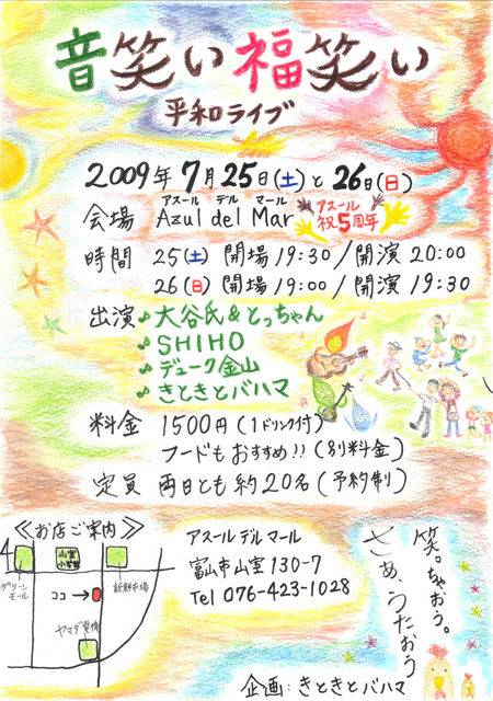 きときとバハマ初の企画ライブのお知らせです♪^^ 予約制なので、土日のどちらに参加するかコメントにもお願いします。 どちらか分からないけど、参加できそうな方も仮予約でコメントお願いします。 ---------------------------------------- 7月25日(土)、26(日)二夜連続☆ 『音笑い 福笑い』平和ライブvol.1 25日(土)19:30オープン 20:00スタート 26日(日)19:00オープン 19:30スタート 会場:アスールデルマール(祝!5周年☆) 富山市山室130-7 出演:大谷氏&とっちゃん SHIHO デューク金山