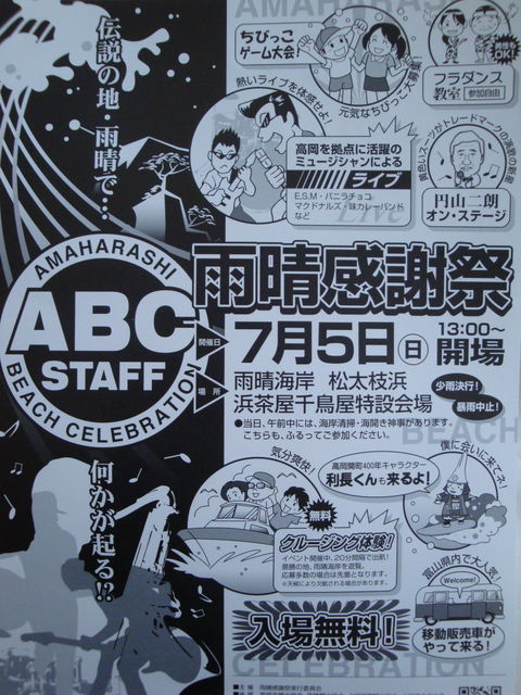 〜雨晴感謝祭/Amaharasi Beach Celebration〜 日時:7月5日(日)13;00〜 場所:雨晴海岸 松太枝浜 浜茶屋千鳥屋特設会場 13:00オープニング 13:05マクドナルズ(from千葉) 13:45<利長くん登場> 13:50E.S.M(ハウスR&Bユニット) 14:15<利長くんと遊ぼう> 14:25バニラチョコ 14:55<ちびっこすいか割りコーナー> 15:05<フラダンス教室> 15:30円山二郎オンステージ(氷見市出身演歌歌手) 15:50味カレーバンド 16:30終了 Amaharasi