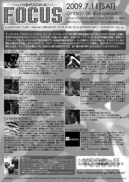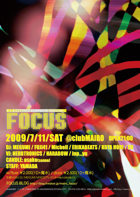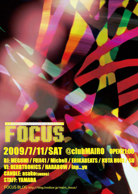 2009/07/11(土) FOCUS@MAIRO OPEN 21:00 WITH FLYER¥2,000 (w/1Drink+魔水) DOOR¥2,500 (w/1Drink+魔水) ※先着でDJ Michell MIXCDプレゼント!!魔水は現定数です。 DJ MEGUMI / FUJI41 / Michell / ERIKABEATS / KOTA HORI / SU VJ HERBTRONICS/inp..yu/HARABOW CANDLE asako(sonne) STAFF YAMADA