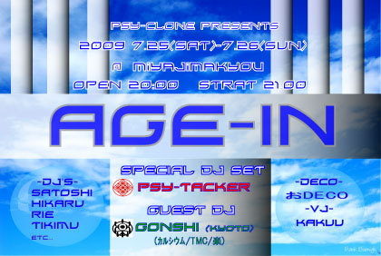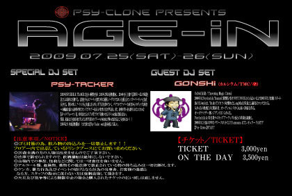 〜PSY−CLONE PRESENTS〜 ■■≪AGE‐IN≫■■ 〜PSY.PROGREESIVE TRANCEPARTY〜 ◆DAY / 2008 - 7.25(sat)〜7.26(sun) ◆PLACE / 富山県小矢部市宮島峡緑の村キャンプ場 ◆OPEN / 22:00〜 END ◆ Ticket ¥3,000 ◆ ON THE DAY ¥3,500 *遠方の方はチケット購入が困難かと思いますので、名前と人数を記入の上、メール頂ければ前売り料金にさせていただきます。 こちらまでメールください♪ ↓ http://mixi.jp/show_profile.pl?id=532825 当日はエントランスにてお