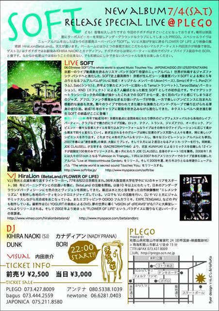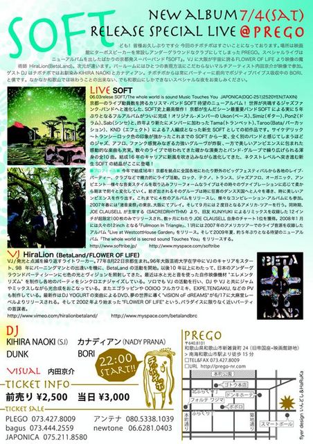 場所は映画館にターボスピーカーを常設しアンダーグラウンドなクラブにしてしまったPREGO。スペシャルライブはニューアルバムを出したばかりの京都発スーパーバンド"SOFT"。VJには大阪が宇宙に誇るFLOWER OF LIFEより映像の魔術師HiraLion(BetaLand)。次元が違います。BARルームにはひとつの表現方法にこだわらないマルチアーティスト内田京介が映像で参加。DJは