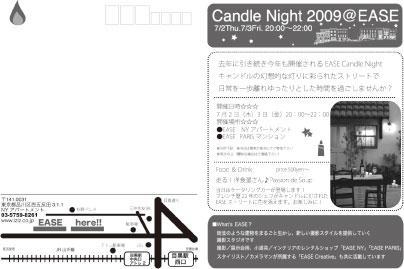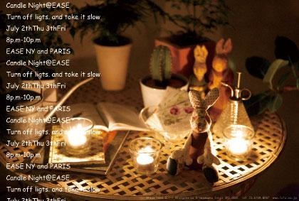 Candle Night 2009@EASE 7/2Thu.7/3Fri.20;00〜22;00 去年に引き続き今年も開催されるEASE Candle Night。 去年はEASEスタジオを開放し、音楽ライブ、食事、そしてもちろんキャンドルといった演出で200人のゲストの方に楽しんでいただきました。 そして今年はEASEストリート、建物の外観をキャンドルで灯し幻想的な空間を作ります。 みなさんで日常を一歩離れたゆっくりとした時間を過ごしませんか? 開催日時 7月2日(木) 3日(金) 20;00〜22;00 開催場所 EASE NYアパートメント EASE PARISマンション ※両棟の間にあるガーデンにて