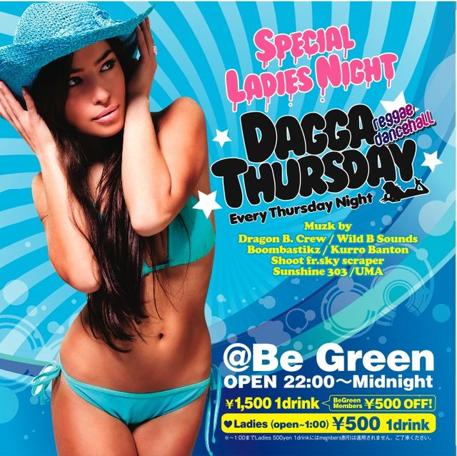 毎週木曜日!!那覇市!!DAGGA THURSDAY!! 管理人様告知失礼します。 CLUB BE GREEN & DRAGON B.C presents 毎週木曜日 ■DAGGA THURSDAY■ -Special Ladies Night- 出演sound ■DRAGON B.C/WILD-B SOUND/SUNSHINE 303/SHOOT fr.sky scraper/KURRO BANTON/DJ SUGAR//BOOMBASTICKZ start 22:00〜 end 28:00 ADM: 男性\1500 with 1drink  女性1時まで入店で\500 with 1drink(menbers card提示で入場無料!) 1時以降は通常料金 place @CLUB BE GREEN(那覇国際通り沿い) 毎週木曜日にレギュラーダンス