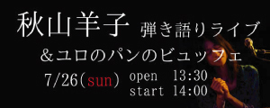 ☆草音楽プレゼンツ 九州ロングTour(6/27〜7/5) 7/2@ねいろや(大分) 7/4@Dream Boat(福岡) 7/10@鈴ん小屋(東京:池袋) ☆北陸ミニミニツアー: 7/11@JAZZ CAFE音食(新潟・長岡) 7/12@村門(富山市) 7/18@nolla cafe(横浜・六角橋) 7/19@STAX FRED(東京・新高円寺) ☆四国ツアー: 7/25@ケセラ(香川・宇多津) 7/26@ブランジュリ*ユロ(愛媛県西条市) -------------------------------------------------------------- 7月2日(木)ねいろや(大分) 秋山羊子(vocal, piano)+ bigmama ◆