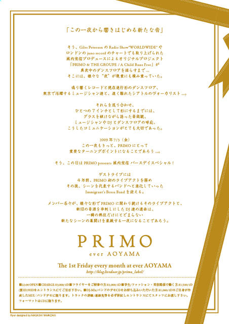 Giles PetersonのRadio Show"WORLDWIDE"やロンドンのjuno recordのチャートでも取り上げられた城内宏信プロデュースによるオリジナルプロジェクト「PRIMO & THE GROUPE / A Child Runs Free」が真夜中のダンスフロアを揺らすまで...そこには、様々な“夜”が幾重にも積み重っていた。鳴り響くレコードと現在進行形のダンスフロア、東京で活躍するミュージシャン達と、遠く離れたシアトルのヴォーカリスト...。それらを巡り合わせ、ひとつの7インチとして形にするまでには、グラスを傾けながら語った音楽観、ミ