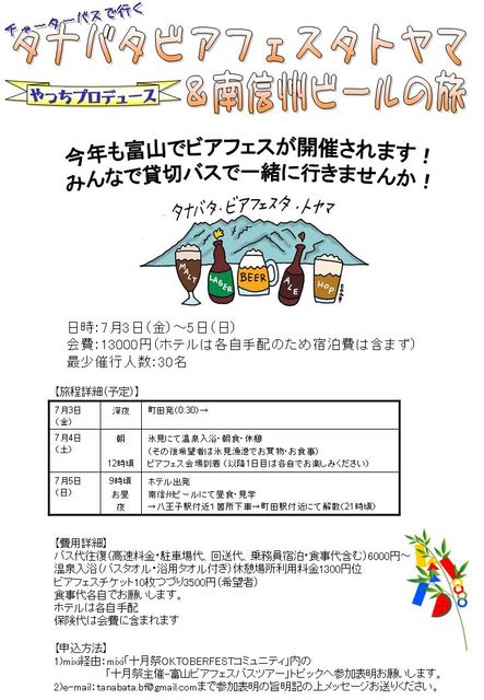 人数が集まらないのですが、バス代振り込みました。 前日まで粘りますので、皆さんのお力で何とかメンバーを増やしてください。 ブログに掲載された場合教えていただけると助かります。 みんなで盛り上げてのフェスです。企業とイベント会社の利益のためでなく、地方活性化、若者の地元意識を高めるためにも成功させたいと思っています。 お友達にもお声掛け下さい。 よろしくお願いします。 昨年富山にバスで行った自分の経験を生かしてツアーを組んでみました。 以下が概要です。 興味のある方は参加表明をお願いいたします。 特