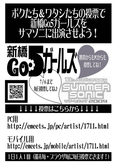 みなさま、こんにちは お元気ですか 既にご存知の方も多いかと思いますが… 私のバンド「新橋Goガールズ」が、サマソニ出演を目指して、WEB投票にエントリーちうです 只今、1800バンドちう50位あたりをしております 7/6まで、あと一週間 携帯から、PCから…1日1ポチ ご協力いただけないでしょうか ぜひ、ぜひ、ぜひお願いしますっ えしてくれる 会社からも奥さまの携帯からも ありがとう〜