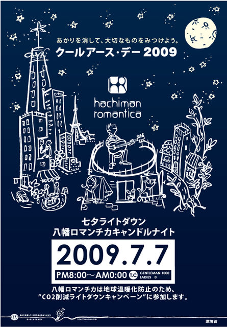 八幡高校OBOGの皆さまいつもご来店ありがとうございます あかりを消して、大切なものをみつけよう クール・アース・デー2009キャンドルナイトinロマンチカ http://coolearthday.jp/ というわけで、環境省が主催する地球温暖化防止のためライトアップ施設の消灯を呼び掛ける「CO2削減/ライトダウンキャンペーン」に参加いたします 7月7日(クール・アース・デー)の七夕ライトダウンには店内の照明を消しまして〜 幻想的なキャンドルでの営業です いつもと違うロマンチカの雰囲気をお楽しみください