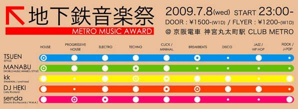 全国、いや全世界的にも珍しいメトロの立地に相応しいNewパーティー、その名も[地下鉄音楽祭]が発車!車掌にはメトロのパーティーの中でも異例の 100回開催を果たした[STYLE]のTSUENやMANABUを始め、関西実力派DJが勢揃い!途中下車無しのアップリフティング超