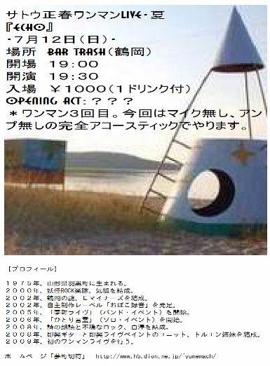 サトウ正春ワンマンLIVE・夏 『ECHO』 ・7月12日(日)・ 場所 BAR TRASH(鶴岡) 開場 19:00 開演 19:30 入場 ¥1000(1ドリンク付) OPENING ACT:??? *ワンマン3回目。今回はマイク無し、アンプ無しの完全アコースティックでやります。エコーはエコ。