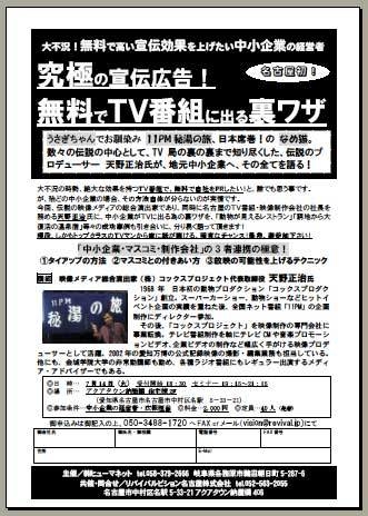 ━名古屋初セミナー!究極の宣伝広告!━ ━07/14━アクアタウン納屋橋━ 大不況で高い宣伝効果を上げたい中小企業の経営者へ! 無料でTV番組に出る裏ワザ!!(PCサイト) http://www.gifu-seminar.biz/archives/51229438.html ━━━━━ なんと、あの伝説のTV企画、うさぎちゃんでお馴染み「11PM 秘湯の旅」や「死ぬまで有効」のなめ猫のディレクションを行った、伝説のTVマン! 名古屋市のTV番組制作&映像制作会社のコックスプロジェクトの天野社長に御登場を願います。 特にテレビの爆発力を活かしてみたい、BtoCの
