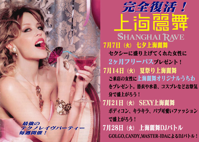 言わずと知れた、最強テクノレイブパーティーの上海麗舞 7月は、毎週開催です 【夏祭り上海麗舞】 ご来店の女性に上海麗舞オリジナルうちわプレゼント! ゆかたや水着、コスプレなどお祭り気分で盛上がろう DJ MASTER IDA・CANDY・GOLGO MUSIC・・・テクノ 場所 :名古屋市中区錦3−23−6宝塚ビルB1F abime 2030 TEL :052