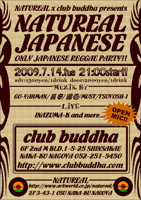 【NATUREAL JAPANESE】 100%JAPANESEREGGAEオンリーパーティー!! 7/14tue 21:00〜 □選曲:JAPANESEREGGAE □LIVE:INAZUMA-K and more../OPEN MIC!! □SELECTOR:GO-YAHMAN/長安/國一/MUST/Tsuyoshi-I □料金:ADV \1500/1D,DAY \2000/1D □OPEN:21:00 START japaneseSKA、japaneseDUB、japaneseROOTS、japaneseDANCEHALL等、 NATUREAL CREWによってセレクトされる極上のジャパニーズレゲエイベント NATUREAL JAPANESE!! みんなが歌える名曲から ディープなROOTS、DUBまで。 まだまだ知らないジャパニ