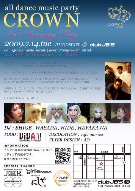 管理人様イベント告知失礼いたします。 不適切と判断された祭にはお手数ではございますが削除をお願いいたします。 「CROWN 〜all dance music〜」は、DEEP HOUSEを中心に、 あらゆるダンスミュージック、クラブミュージックを取り込んだ、 踊る楽しさを知るためのパーティです。 このコンセプトのもとにパーティを開催し続け、 今回で3周年を迎えることになりました。 これを記念して、今回のパーティは、 千種区のカフェ、「Vivan!」が出張出店してフードを販売。 さらに、名古屋の各クラブでパーティを彩る 魅惑のドラァグ