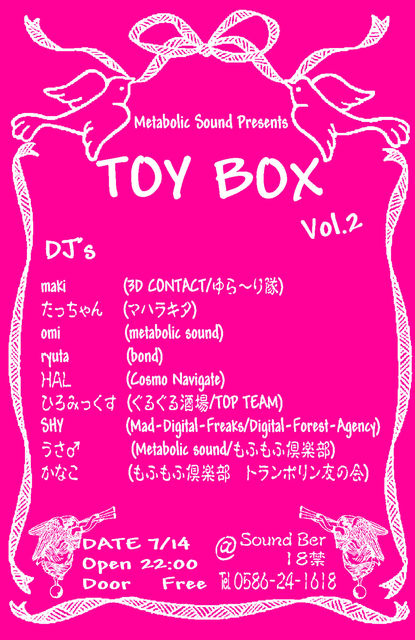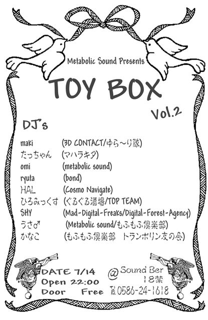 ひろみさん 告知失礼致します。 ☆★☆Metabolic Sound Presents☆★☆ 【TOY BOX】 vol.2 Psychederic Trance Free Party 2009/7/14(火) start 22:00〜 @SOUND BAR 18禁 Door Free 昼間は賑やかな商店街も、夜の帳が降りる頃にはすっかり静かになって、人々は眠りに就きます。そこへ幽かに流れてくる不思議な音色。どこから?辿っていった先にあったのは、不思議な音のオモチャ箱。 老若男女、音の好み、お客さんとスタッフ、それらの垣根を取り払って皆で一つの空間