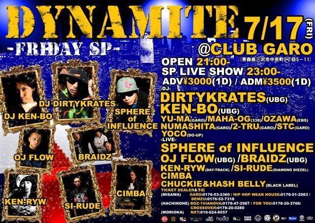7/17(FRI) @CLUB GARO (青森県三沢市中央町2丁目5−11) OPEN 21:00- SP LIVE SHOW 23:00- 前売り3000円(1D) 当日3500円(1D) DJ Dirty Krates AKA Zeebra北東北初上陸!! -GUEST DJ- DIRTYKRATES aka ZEEBRA(UBG) KEN-BO(UBG) -DJ- YU-MA(GARO) MAHA-OG(338) OZAWA(EBS) NUMASHITA(GARO) 2-TRU(GARO) STC(GARO) YOCO(DO↑UP) -SP LIVE- SPHERE of INFLUENCE OJ FLOW(UBG) BRAIDZ(UBG) KEN-RYW SI-RUDE(D.D.P) CIMBA CHUCKIE&HASH BELLY(BLACK LABEL) TICKET DEALER&予約