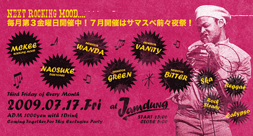 告知失礼致します。 毎月第3金曜日開催 ROCKING MOOD JAMAICAN 60's to 70's SKA.ROCKSTEADY.REGGAE 多くのレゲエ好きがこぞって注目する スカ、ロックステディ、レゲエ、ルーツなどのジャマイカン・オールディーズ。 今なお、進化を続けるダンスホールレゲエの礎を作った音楽であり、 もっともタフで、ラフであった時代の音楽。 ただの古い音楽と侮るなかれ! 今なお当時の熱気を放ち続ける珠玉のヴィンテージ・ミュージック! 毎月第3金曜日開催中のROCKING MOODで、ぜひ体感してください! なお、週末19日日曜日には須磨海岸の海の