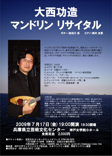 大西功造マンドリンリサイタル 2009年7月17日(金) 兵庫県立芸術文化センター小ホール(阪急西宮北口南改札すぐ) 開場18:30 開演19:00 入場料 2,000円 (全席自由) 曲目 長岡克己/KAZE A.カラス/第三の男 N.ロータ/太陽がいっぱい C.ムニエル/ヴェニスの謝肉祭 スペイン風奇想曲 T.アルビノーニ/アダージョ H.ヴュータン/アメリカの思い出 H.ヴェニヤフスキ/華麗なるポロネーズ第二番 R.カラーチェ/マンドリン協奏曲第一番 ほか ギター