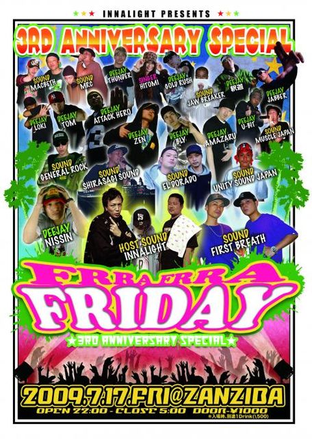 今月、第3金曜日 7月17日(金)の FRRA FRRA FRIDAY @ZANZIBA はというと・・・ 3周年アニバーサリーSPECIAL フラフラにゆかりの深〜い 地元のサウンド&アーティストが豪華勢揃い まさに、兵庫レゲエのオールスター戦です 今年の夏はフラフラ3周年からスタート 来ないと損しますよー フラフラ恒例となってます 振る舞いテキーラ&シャンパンも 300%以上増量しま〜す さらに、シークレットゲス