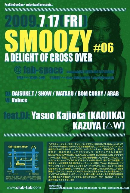 お待たせしました!! SMOOZY #6 psychoqoocan × enjoy jazz!! presents... "SMOOZY #06" 7/17 (fri) open22:00~5:00close door2000yen(1d) / adv1500yen(1d) ジャンル: house / techno/ crossover etc... FEATUREING DJ: Yasuo kajioka(KAOJIKA) / KAZUYA(△W) DJ: DAISUKE.T / SHOW / WATARU / BOM CURRY/ ARAB VJ: KALEIDO club @fab-space 兵庫県姫路市魚町68KYOEIビルB1F http://www.club-fab.com TEL: 079-222-2882 今回も他では出せないパ