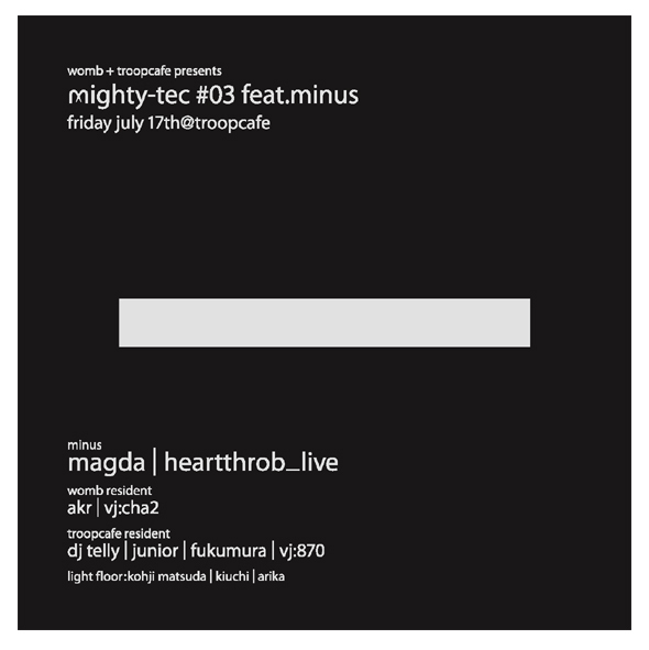 日本のクラブシーンを牽引し、時代を先導する東京のトップクラブWOMBと、関西のダンスミュージックシーンの担い手TROOPCAFEがジョイントするプロジェクトである「MIGHTY-TEC」の3回目の開催が決定した。 そして今回は遂にミニマルテクノのパイオニアであるRICHIE HAWTINが主宰する"MINUS"レーベルとのコラボレートに成功!ゲスト出演するのは、RICHIE HAWTINが最も信頼する女性DJ MAGDA!そして、昨年のテクノ界で最も注目を浴びたといっても過言ではないHEARTTHROBがスペシャルLIVE SETを披露する。 WOMBとTROOPCAFEが提唱する次世代のクラブシ