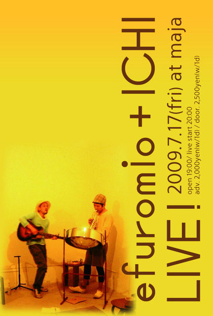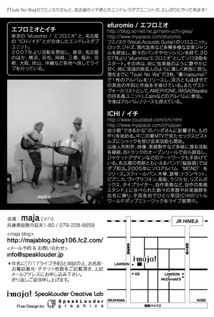 理人様、告知失礼致します。 毎回ほんと大人気!老若男女を虜にしてしまう、千両役者、イチ君と、 ツキノワのフミノスケさんとの、エンドレスダブユニットが、久しぶりにやって来ます!! 不思議空間を味わいたい方は、とにかく皆さん集合です! お待ちしています!!! ◆09年7月17日(金) LIVE:efuromio + ICHI エフロミオ http://blog.so-net.ne.jp/nami-uchi-giwa/ http://www.myspace.com/efuromio イチ http://www.couplabel.com/ichi.html http://www.myspace.com/ichijapan open 19:00/ live start