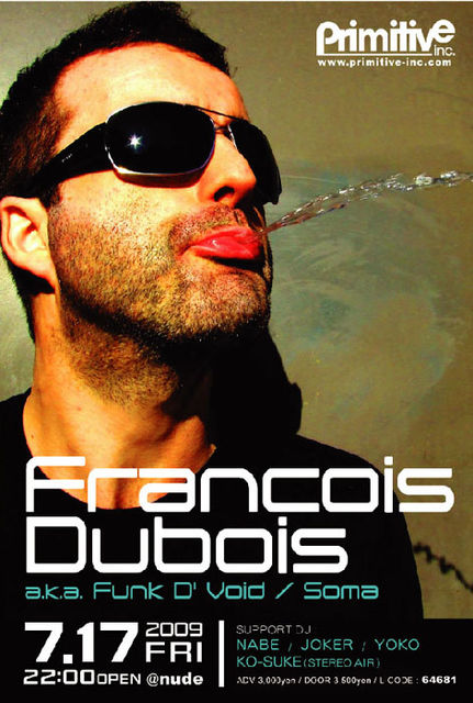 Francois Dubois a.k.a. Funk D' Void / Soma @nude ♪:HOUSE & TECHNO MAIN DJ:Francois Dubois a.k.a. Funk D' Void Francois Dubois a.k.a. Funk D' Void (Soma / from Barcelona) トップ・テクノ・クリエイターとして著名なFunk D’ Voidのディープな音楽性を表現している別名義Francois Dubois。 Danny Howells、Jimpster、Satoshi Tomiieなどが頻繁にプレイをしていた“I Try”や“Blood”が大ヒットとなり、Francois Duboisとしても確固たる評価を確立した。Funk D' Void名義では、UKのトップ・レーベルSomaから