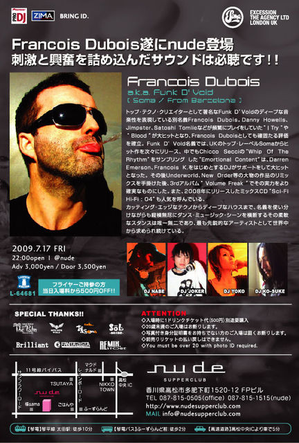 今回はやっと開催権利を勝ち取り、4都市に入り込めました。 東京、大阪、京都と来ての 香川開催!! Francois Dubois a.k.a. Funk D' Void / Soma @nude ♪:HOUSE & TECHNO MAIN DJ:Francois Dubois a.k.a. Funk D' Void Francois Dubois a.k.a. Funk D' Void (Soma / from Barcelona) トップ・テクノ・クリエイターとして著名なFunk D’ Voidのディープな音楽性を表現している別名義Francois Dubois。 Danny Howells、Jimpster、Satoshi Tomiieなどが頻繁にプレイをしていた “I Try”や“Blood”が大ヒッ