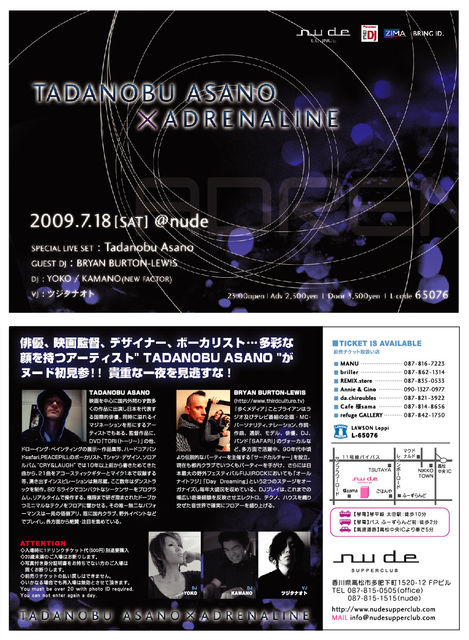 管理人様 香川より告知失礼します 18日はいよいよ 世界の<Tadanobu Asano>がnudeに!! 7/17(金) Francois Dubois a.k.a. Funk D' Void / Soma @nude ♪:HOUSE & TECHNO MAIN DJ:Francois Dubois a.k.a. Funk D' Void Francois Dubois a.k.a. Funk D' Void (Soma / from Barcelona) DJ:NABE / JOKER / YOKO / KO-SUKE(STEREO AIR) TIME:22:00open PRICE:Adv2,500yen / Door3,500yen ※入場時に1dt別途要購入。 LAWSON TICKET CODE:64681 7/18(土) Tadanobu Asano×