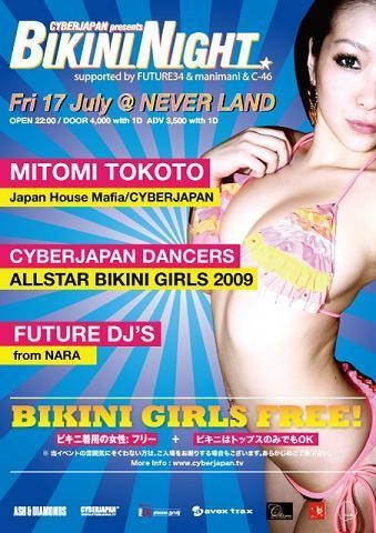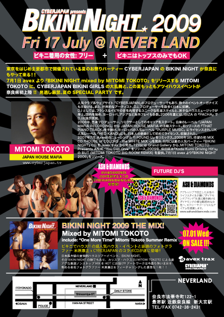 2009-07-17(金) -CYBERJAPAN presents BIKINI NIGHT 2009- -supported by FUTURE34 & manimani & C-46- 場所:NEVER LAND (奈良) http://nara-neverland.com/ ■【DJ】MITOMI TOKOTO & FUTURE DJ'S ■【SHOW】CYBERJAPAN ALL STAR BIKINI GIRLS オープン / スタート 22:00 / 22:00 前売 / 当日 \3500 / \4000 東京をはじめ主要都市で開催されている夏のお祭りパーティー CYBERJAPAN の BIKINI NIGHT が奈良にもやって来る!! 7月にavex から『BIKINI NIGHT mixed by MITOMI TOKOTO』をリリースする MITOMI TOKOTOに、