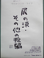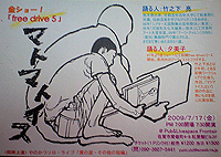 毎回、素敵なラインナップでお送りしております金ショー! 今回7月17日の金曜は、ダンスと一人芝居でお楽しみください。 ★ダンス「free drive 5」 『キオクの欠片』/『マトマトイス』 【19:30〜】 ★一人芝居「やのかつソロ・ライブ」 『 屑の涙・その他の短編 』 【20:00〜(予定)】 「free drive 5」・『キオクの欠片』出演:夕美子 『マトマトイス』構成・出演:竹之下 亮 【 夕美
