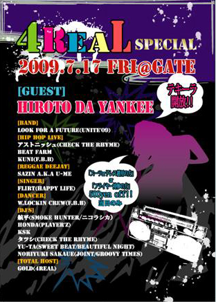 4REAL SPECIAL 2009.7.17 FRI@GATE 【GUEST】 HIROTO DA YANKEE 【BAND】 LOOK FOR A FUTURE(UNITE'09) 【HIP HOP LIVE】 アストニッシュ(CHECK THE RHYME) BEAT FARM KUNI(F.B.B) 【SINGER】 FLIRT(HAPPY LIFE) 【DANCER】 W.LOCKIN CREW(F.B.B) 【DJ'S】 航平(SMOKE HUNTER/ニコラシカ) HONDA(PLAYER'Z) KSK タツシ(CHECK THE RHYME) YU-TA(SWEET BEAT/BEAUTIFUL NIGHT) NORIYUKI SAKAUE(JOINT/GROOVY TIMES) 【TOTAL HOST】 GOLD(4REAL) ・テキーラ開放!! ・スーツorドレス着用の方、フライヤー持参の